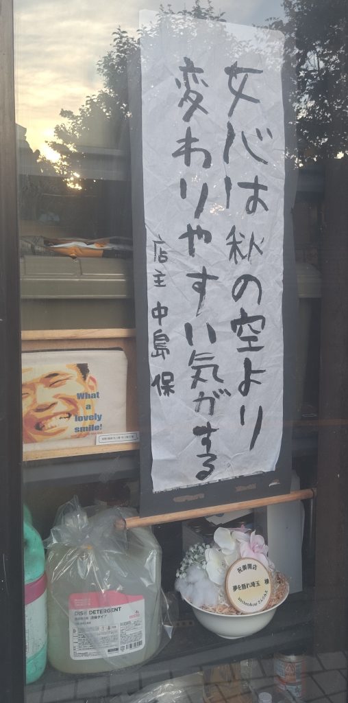 2025年10月2日 / 最終更新日時 : 2025年10月2日 中島 保 当店独自の取り組み 今月の標語 毎月、店主の書き初めを更新してる謎行動の今月の標語は「女心は秋の空より変わりやすい気がする」となりました。近づくほどに遠く。それは僕がいつも女性に対して感じていることで、それは変わりやすい心が正体なのではないかと思うんですよね。なおこの書き初めコーナーのインスパイア店は常に募集してます。許可とかいらないんで、自由に続いてください!