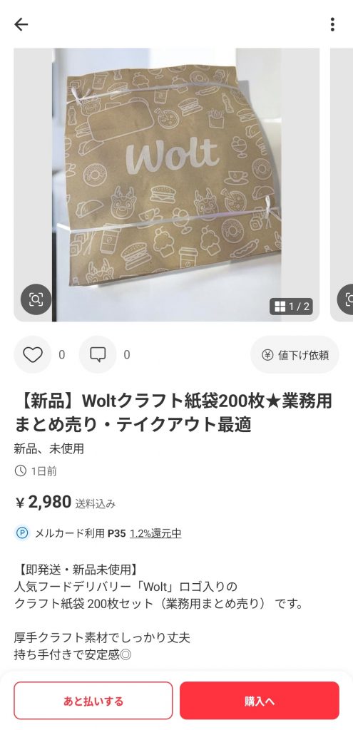 使ってる途中にメルカリでその袋が転売されてるのを見て「うわ~、売ればよかったな」とは思わず、注文番号を袋に書きやすかったりもしたので、こちらとしてはWolt様々だったのです。