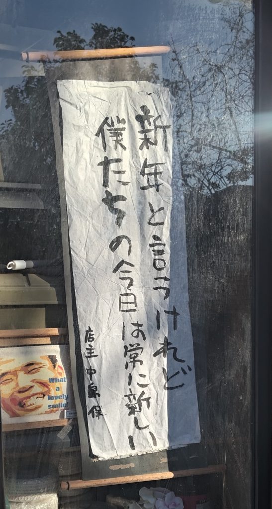 2026年1月5日 / 最終更新日時 : 2026年1月5日 中島 保 当店独自の取り組み 1月の標語 毎月、誰が望むわけではなく、更新されている、店主による店頭の書き初めコーナーの今月の標語は「新年と言うけれど、僕たちの今日は常に新しい」となりました。人間は毎日生まれ変わるとも言えるところがあり、例えば今日ダメだったとしても、明日はなにか変わるかもしれないですので、そんな気持ちを込めてのものです。そんなわけで2026年も毎月更新していきますので、この取り組みを模倣したい店舗さんは無許可でどんどんと続いてください!