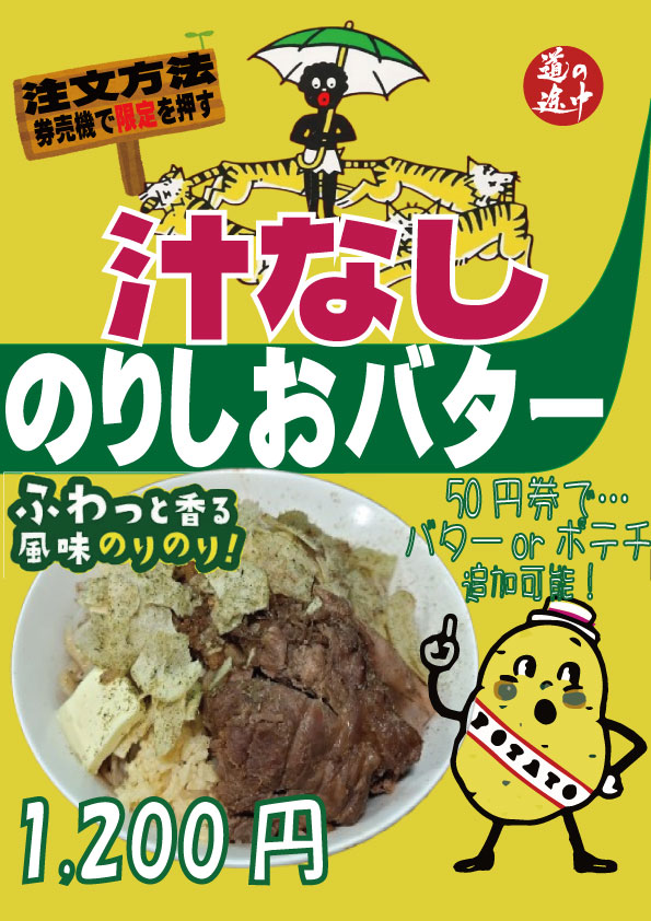 先週から販売開始し、おかげさまで大好評を頂いている、のりしおバター汁なしに載っているポテトチップスのりしおを50円券で増やせるようにしました。